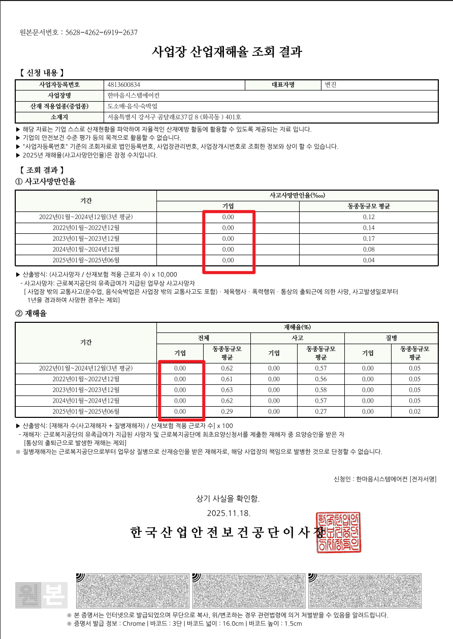 최근 3년간 사업장 산업재해율 0건